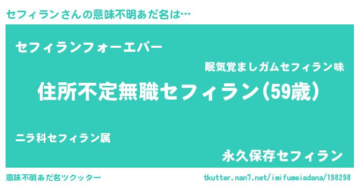 | 男性向けラノベタイトル風あだ名 | 『セフィランに滅ぼされるだけの簡単なお仕事です』 |