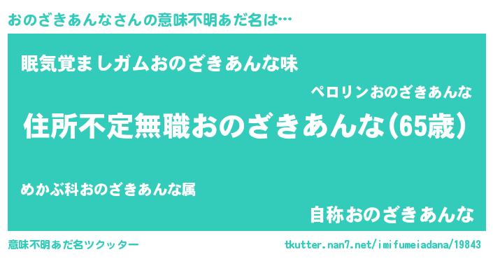 | 男性向けラノベタイトル風あだ名 | 『うちのおのざきあんなが世界を掌握している!』 |