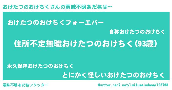 | 胡散臭い通販商品みたいなあだ名 | 『あなたにだけ特別に提供する世界で10本だけ現存している希少なブランデー…その名も「おけたつのおけちく」』 |