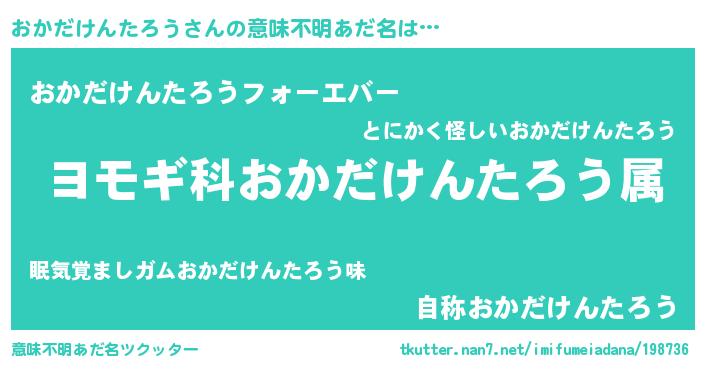 | 男性向けラノベタイトル風あだ名 | 『うちのおかだけんたろうが世界を掌握している!』 |