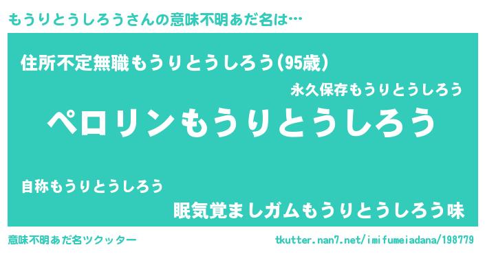 | 男性向けラノベタイトル風あだ名 | 『モウリトウシロウアートオンライン』 |