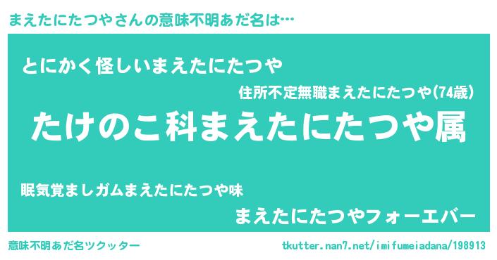 | 男性向けラノベタイトル風あだ名 | 『転生したらまえたにたつやだった件』 |