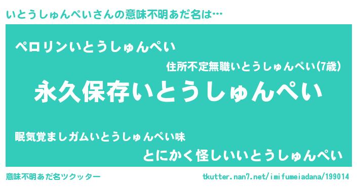 | 男性向けラノベタイトル風あだ名 | 『いとうしゅんぺいという概念が存在しない退屈な世界 』 |