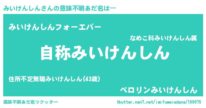 | 男性向けラノベタイトル風あだ名 | 『うちのみいけんしんが世界を掌握している!』 |