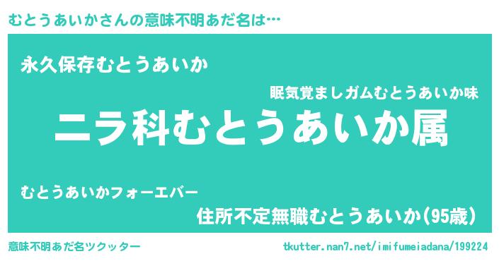 | 男性向けラノベタイトル風あだ名 | 『むとうあいか~年齢イコール彼女いない歴の魔法使い~』 |