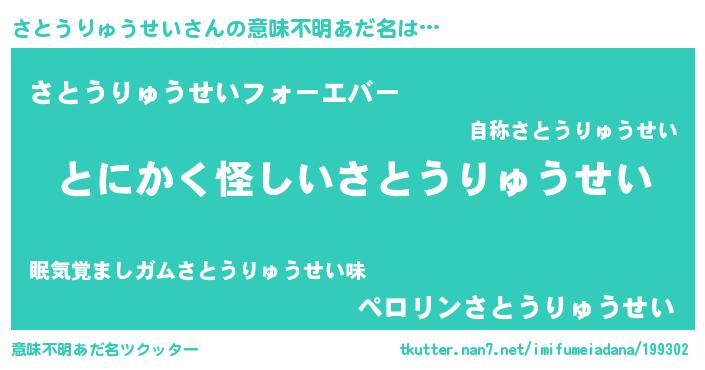| 胡散臭い通販商品みたいなあだ名 | 『信頼と実績のサプリメント…その名も「さとうりゅうせい」』 |