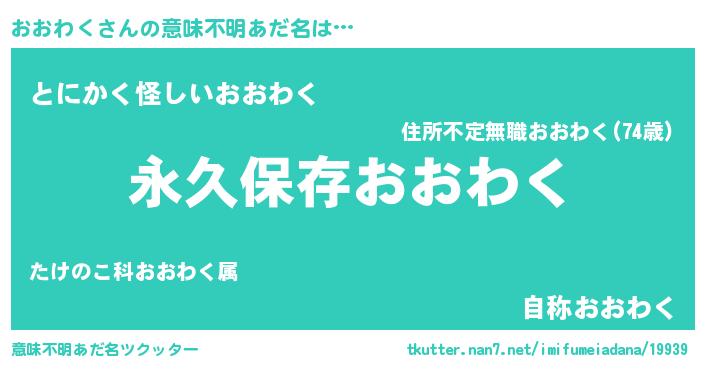 | 男性向けラノベタイトル風あだ名 | 『おおわくという概念が存在しない退屈な世界 』 |