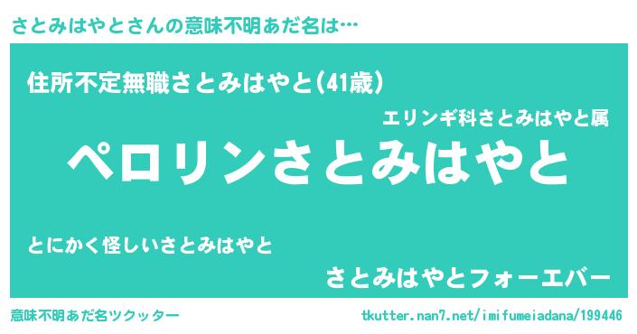 | 胡散臭い通販商品みたいなあだ名 | 『モテモテ間違いなし霊験あらたかなお札…その名も「さとみはやと」』 |