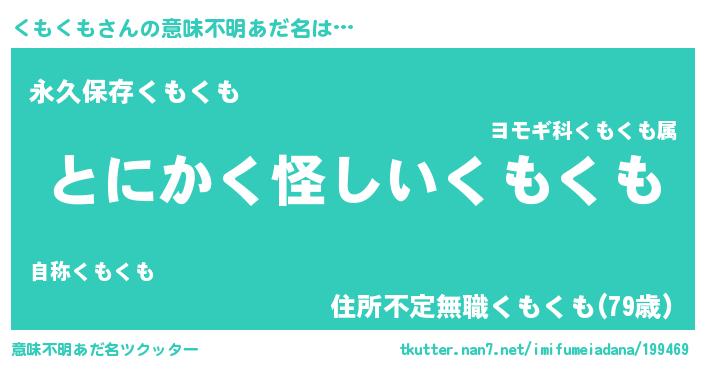 | 胡散臭い通販商品みたいなあだ名 | 『信頼と実績のサプリメント…その名も「くもくも」』 |