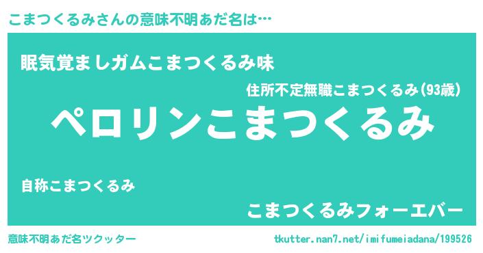 | 男性向けラノベタイトル風あだ名 | 『こまつくるみに滅ぼされるだけの簡単なお仕事です』 |