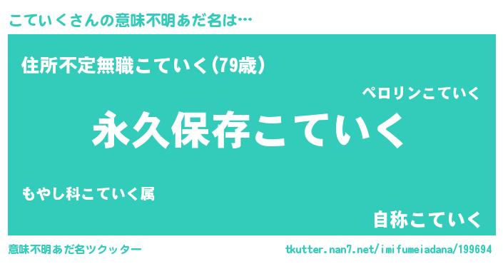 | 男性向けラノベタイトル風あだ名 | 『こていくという概念が存在しない退屈な世界 』 |
