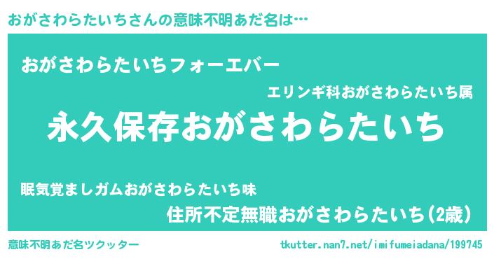 | 男性向けラノベタイトル風あだ名 | 『おがさわらたいちという概念が存在しない退屈な世界 』 |