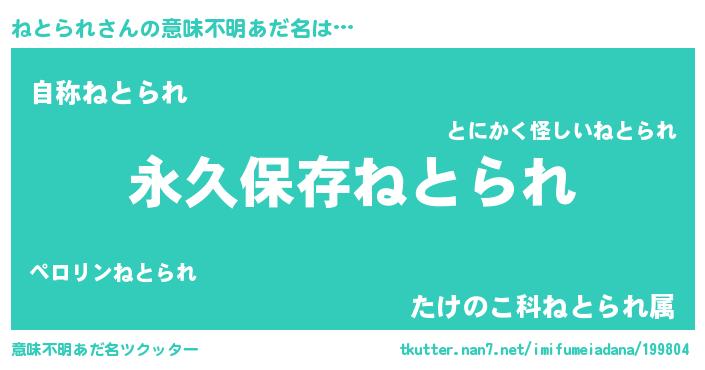 | 男性向けラノベタイトル風あだ名 | 『ねとられという概念が存在しない退屈な世界 』 |