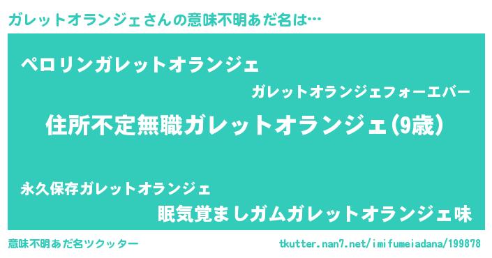 | 欧米人風あだ名 | 『アンジェラ・ガレットオランジェ』 |