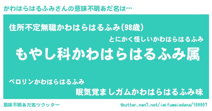| 男性向けラノベタイトル風あだ名 | 『転生したらかわはらはるふみだった件』 |