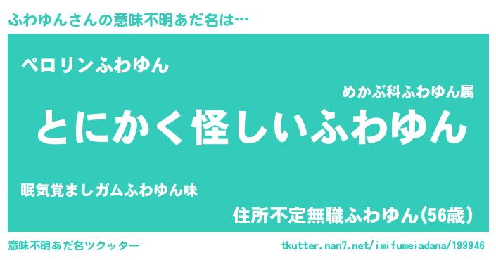 | 胡散臭い通販商品みたいなあだ名 | 『信頼と実績のサプリメント…その名も「ふわゆん」』 |
