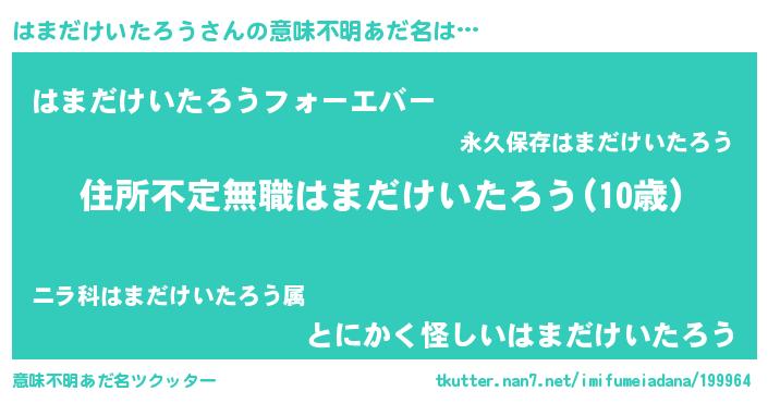| 男性向けラノベタイトル風あだ名 | 『この素晴らしい世界にはまだけいたろうを!』 |