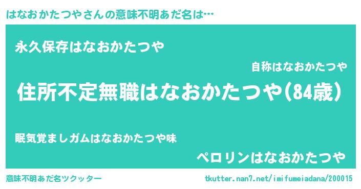 | 胡散臭い通販商品みたいなあだ名 | 『ハリウッド女優が絶賛した世界で10本だけ現存している希少なブランデー…その名も「はなおかたつや」』 |