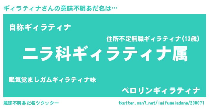 | 男性向けラノベタイトル風あだ名 | 『ギィラティナ~年齢イコール彼女いない歴の魔法使い~』 |