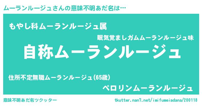 | 男性向けラノベタイトル風あだ名 | 『Re:ムーランルージュから始める異世界生活』 |