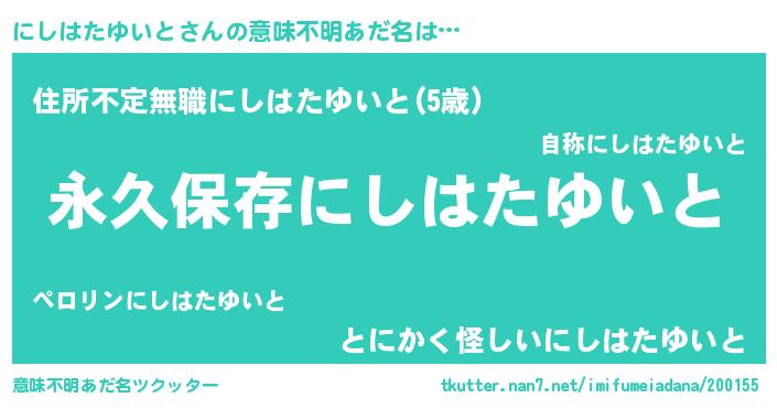 | ヘコむあだ名 | 『にしはたゆいと(笑)』『にしお』 |