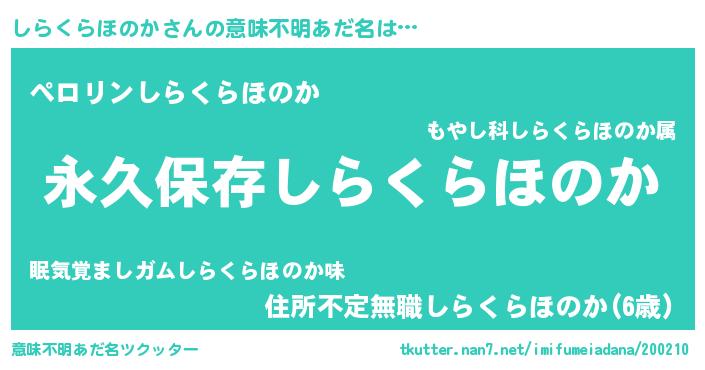 | 胡散臭い通販商品みたいなあだ名 | 『前代未聞の健康食品…その名も「しらくらほのか」』 |
