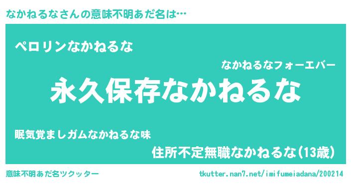 | 胡散臭い通販商品みたいなあだ名 | 『来世でも幸せになれる健康食品…その名も「なかねるな」』 |
