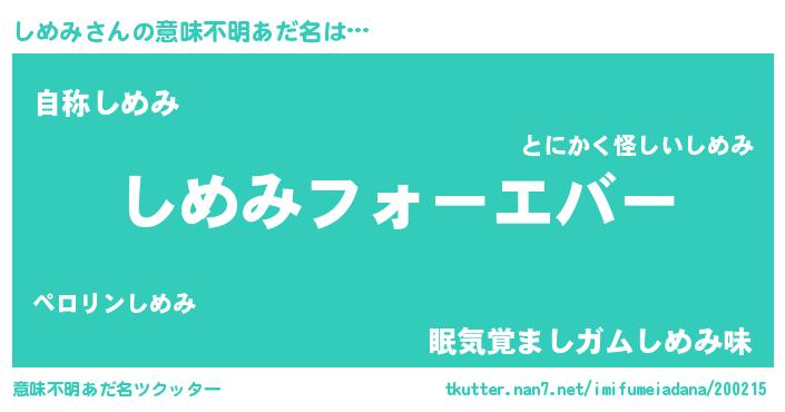 | ヒーロー風カッコイイあだ名 | 『ウルトラしめみマン』『究極戦士シメミ』 |