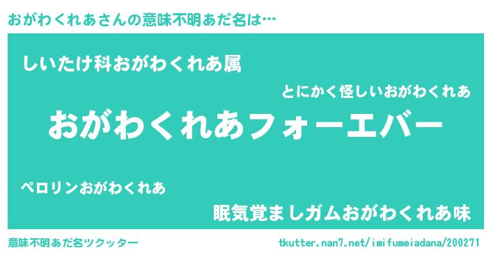 | 欧米人風あだ名 | 『おがわくれあクリステル』 |