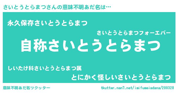 | 男性向けラノベタイトル風あだ名 | 『Re:さいとうとらまつから始める異世界生活』 |