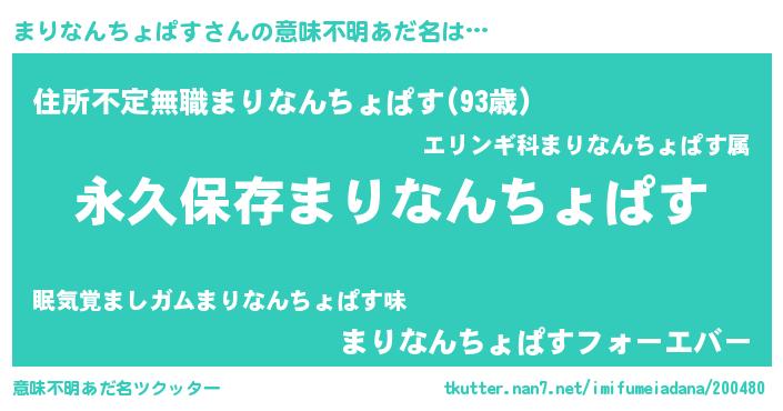 | 胡散臭い通販商品みたいなあだ名 | 『来世でも幸せになれる水素水…その名も「まりなんちょぱす」』 |