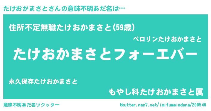 | 男性向けラノベタイトル風あだ名 | 『やはりたけおかまさとの青春ラブコメはまちがっている 』 |