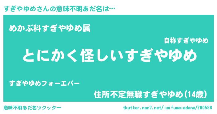 | 男性向けラノベタイトル風あだ名 | 『すぎやゆめの嫁は女の子じゃないと思った?』 |