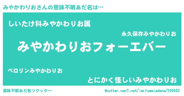 | 男性向けラノベタイトル風あだ名 | 『みやかわりおに滅ぼされるだけの簡単なお仕事です』 |