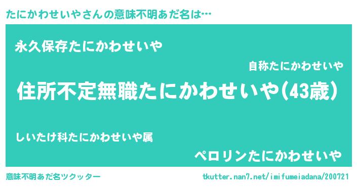 | 男性向けラノベタイトル風あだ名 | 『この素晴らしい世界にたにかわせいやを!』 |