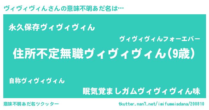 | 女子向けラノベタイトル風あだ名 | 『ヴィヴィヴィんが死なない童話 林檎のヴィヴィヴィんの診療簿』 |