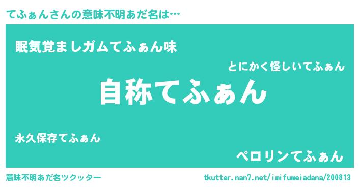 | 男性向けラノベタイトル風あだ名 | 『Re:てふぁんから始める異世界生活』 |