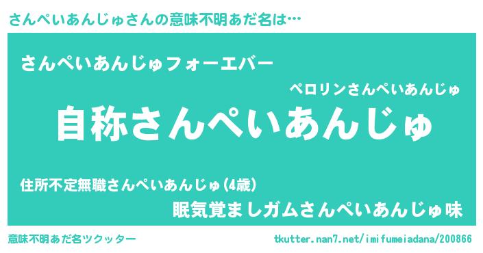 | 男性向けラノベタイトル風あだ名 | 『Re:さんぺいあんじゅから始める異世界生活』 |