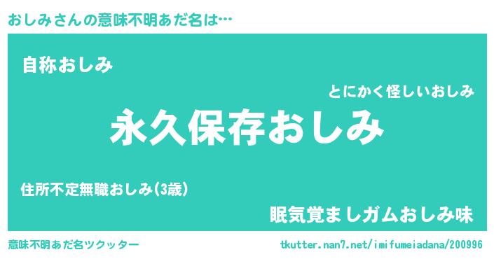 | 男性向けラノベタイトル風あだ名 | 『おしみという概念が存在しない退屈な世界 』 |