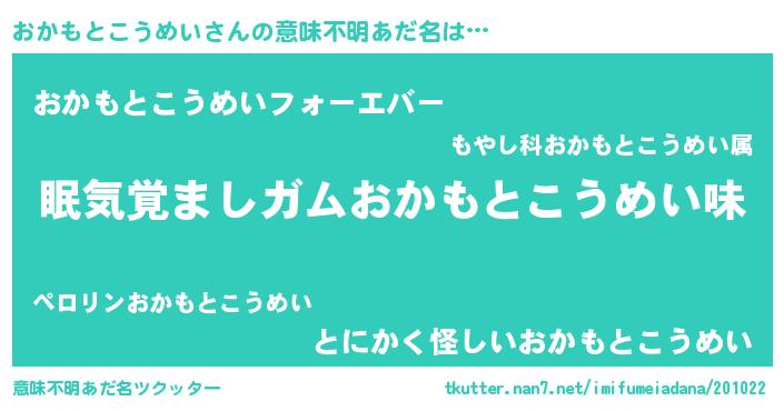 | 男性向けラノベタイトル風あだ名 | 『おまえをオタクにしてやるから、俺をおかもとこうめいにしてくれ! 』 |