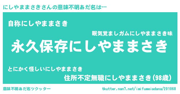 | 男性向けラノベタイトル風あだ名 | 『にしやままさきという概念が存在しない退屈な世界 』 |