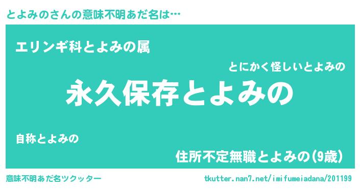 | 男性向けラノベタイトル風あだ名 | 『とよみのという概念が存在しない退屈な世界 』 |
