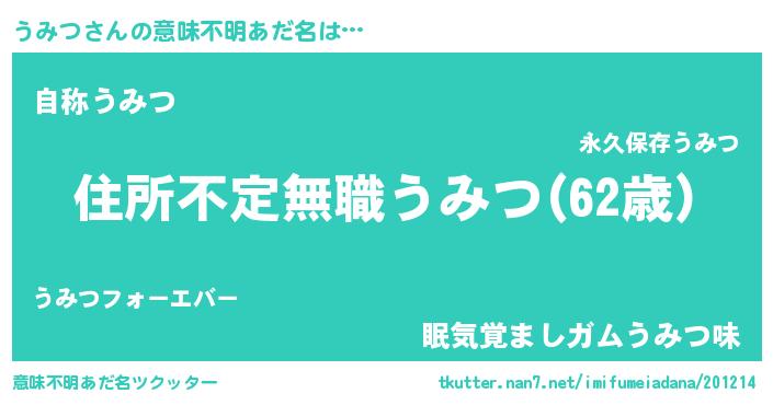 | 男性向けラノベタイトル風あだ名 | 『この素晴らしい世界にうみつを!』 |
