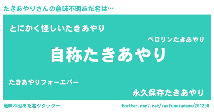 | 男性向けラノベタイトル風あだ名 | 『Re:たきあやりから始める異世界生活』 |