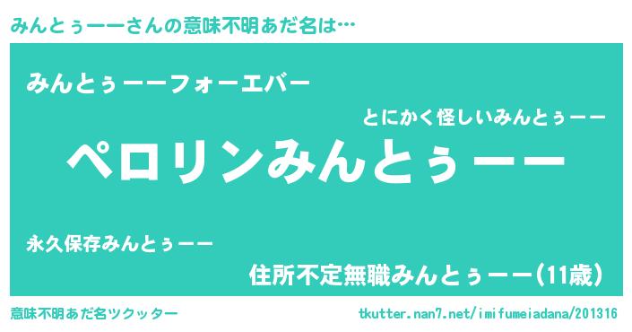 | 男性向けラノベタイトル風あだ名 | 『みんとぅーーの憂鬱』 |