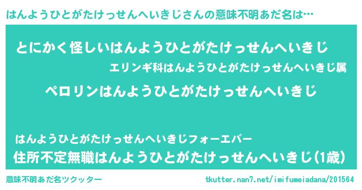 | 男性向けラノベタイトル風あだ名 | 『ハンヨウヒトガタケッセンヘイキジアートオンライン』 |