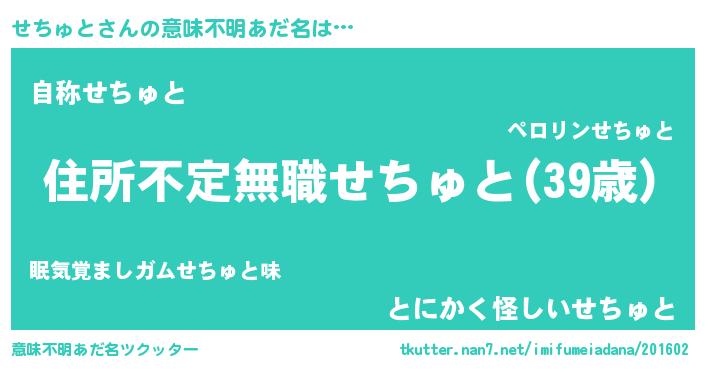 | 男性向けラノベタイトル風あだ名 | 『魔弾の王とせちゅと』『せちゅとの憂鬱』 |