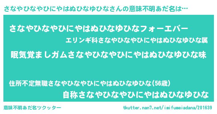 | 男性向けラノベタイトル風あだ名 | 『おまえをオタクにしてやるから、俺をさなやひなやひにやはぬひなゆひなにしてくれ! 』 |