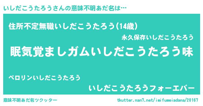 | 男性向けラノベタイトル風あだ名 | 『ノーゲーム・ノーイシダコウタロウ』 |