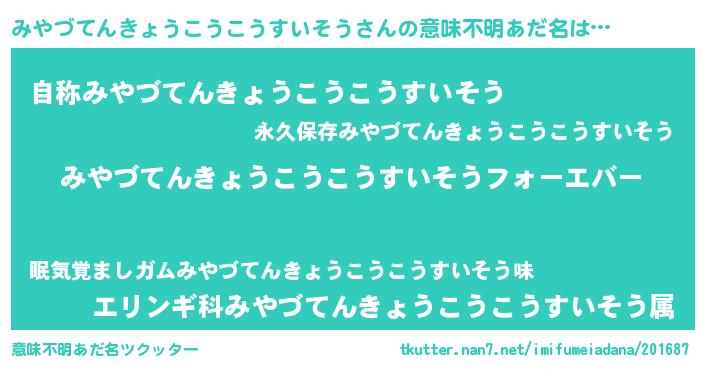 | 胡散臭い通販商品みたいなあだ名 | 『世界が平和になる高級そうな壺…その名も「みやづてんきょうこうこうすいそう」』 |